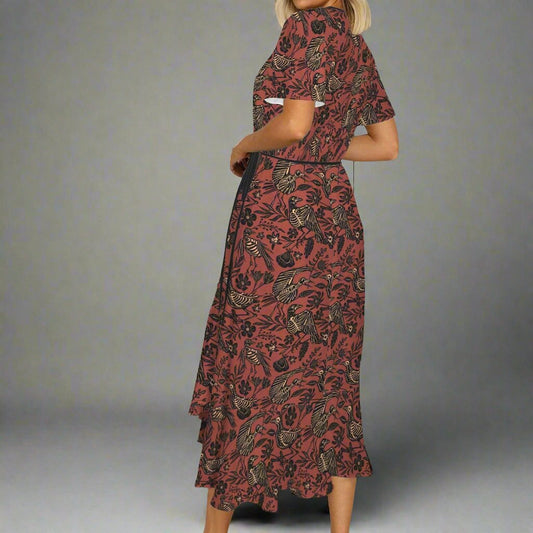 Spooky Autumn Bird Skeleton Wrap Dress - Rust Red