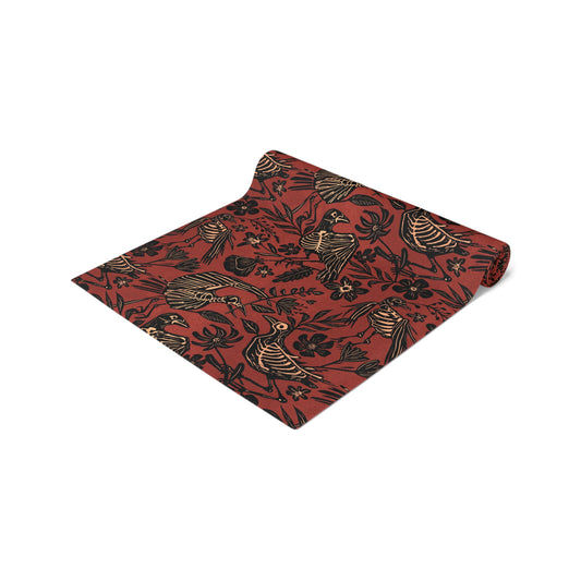 Autumn Folk Art Bird Skeleton Table Runner - Rust Red