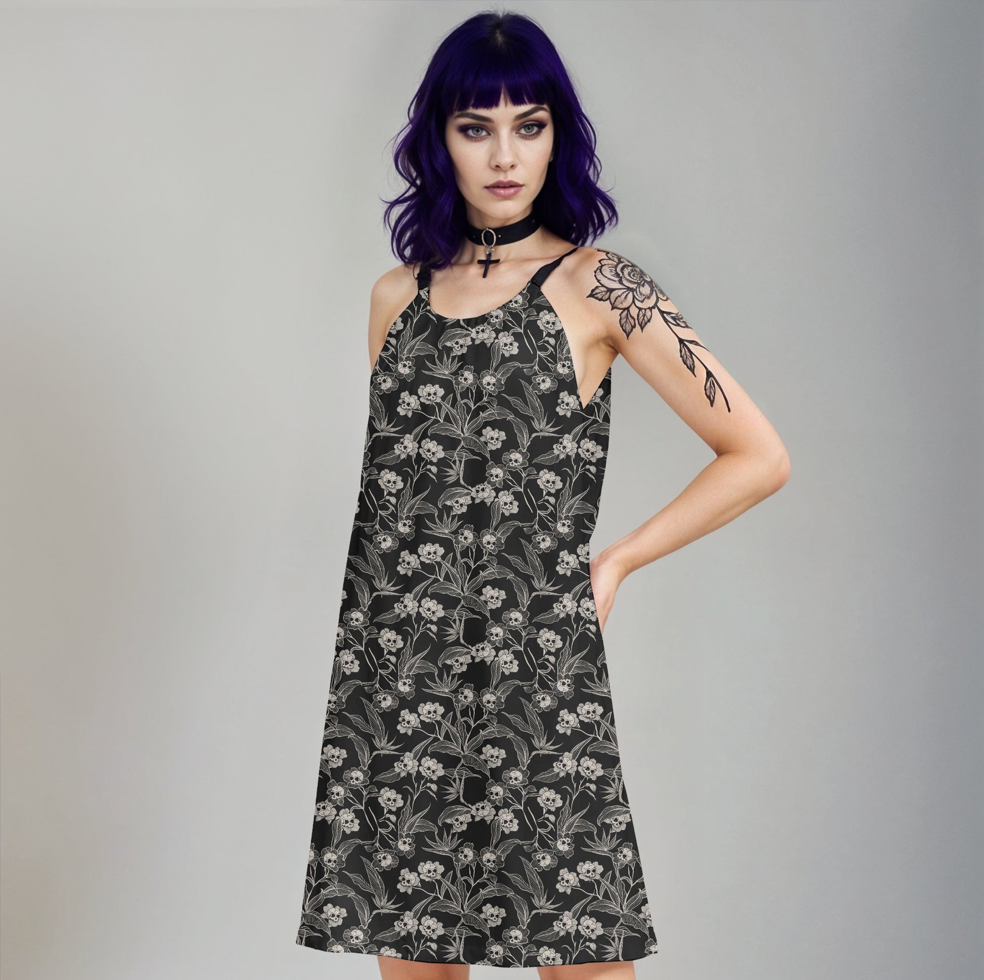 This spooky cute gothic floral dress is comfortable and available up to 5XL to fit any body. Made from 190gsm jersey knit cotton material and featuring my spooky tiki skull flower print. Perfect for warm summer days or paired with your favorite leggings in the cooler months, this flowy dress is the perfect addition to any gothic wardrobe.