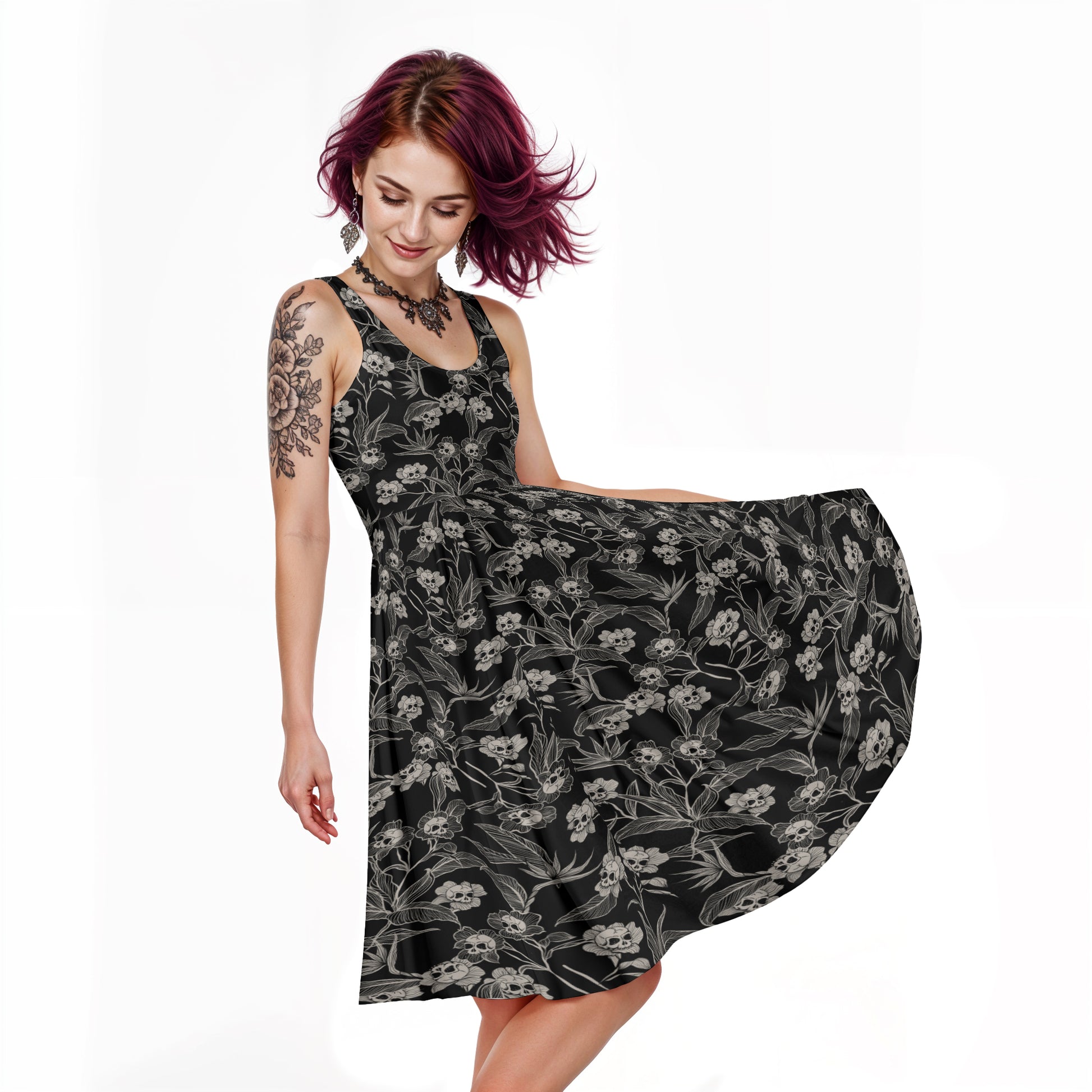 This casual skull flower dress with pockets is available up to 6XL to fit any body. Made from a smooth and stretchy material and featuring my spooky tiki gothic floral floral print in black and off-white. Perfect for warm summer days or paired with your favorite leggings in the cooler months, this casual dress is the perfect addition to any gothic wardrobe.
