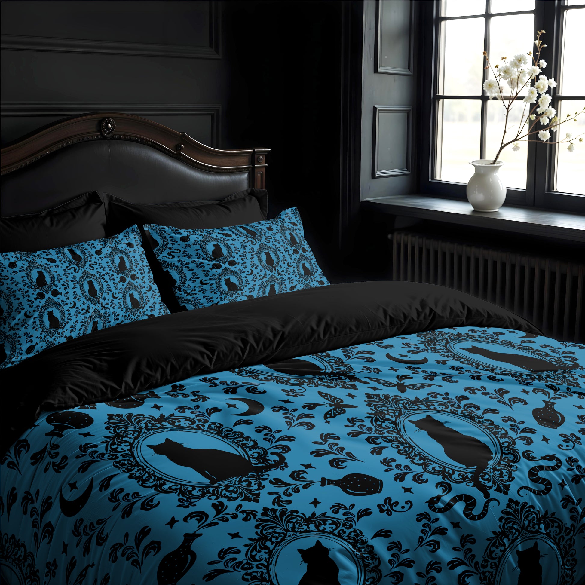 Curl up in dark and moody style with the ultimate bed set for any witchy cat lover - my victorian kitty bedding in vibrant teal and black hues. Made from smooth and long-lasting microfiber, this bedding features a striking baroque pattern infused with witchy and goth elements, adding a touch of dark elegance to your decor. Each set includes a duvet cover and two pillowcases with the print on one side and a black back. The stitching and zipper are white. Give your bedroom the perfect centerpiece with this striking gothic bedding. Please see images for size chart.